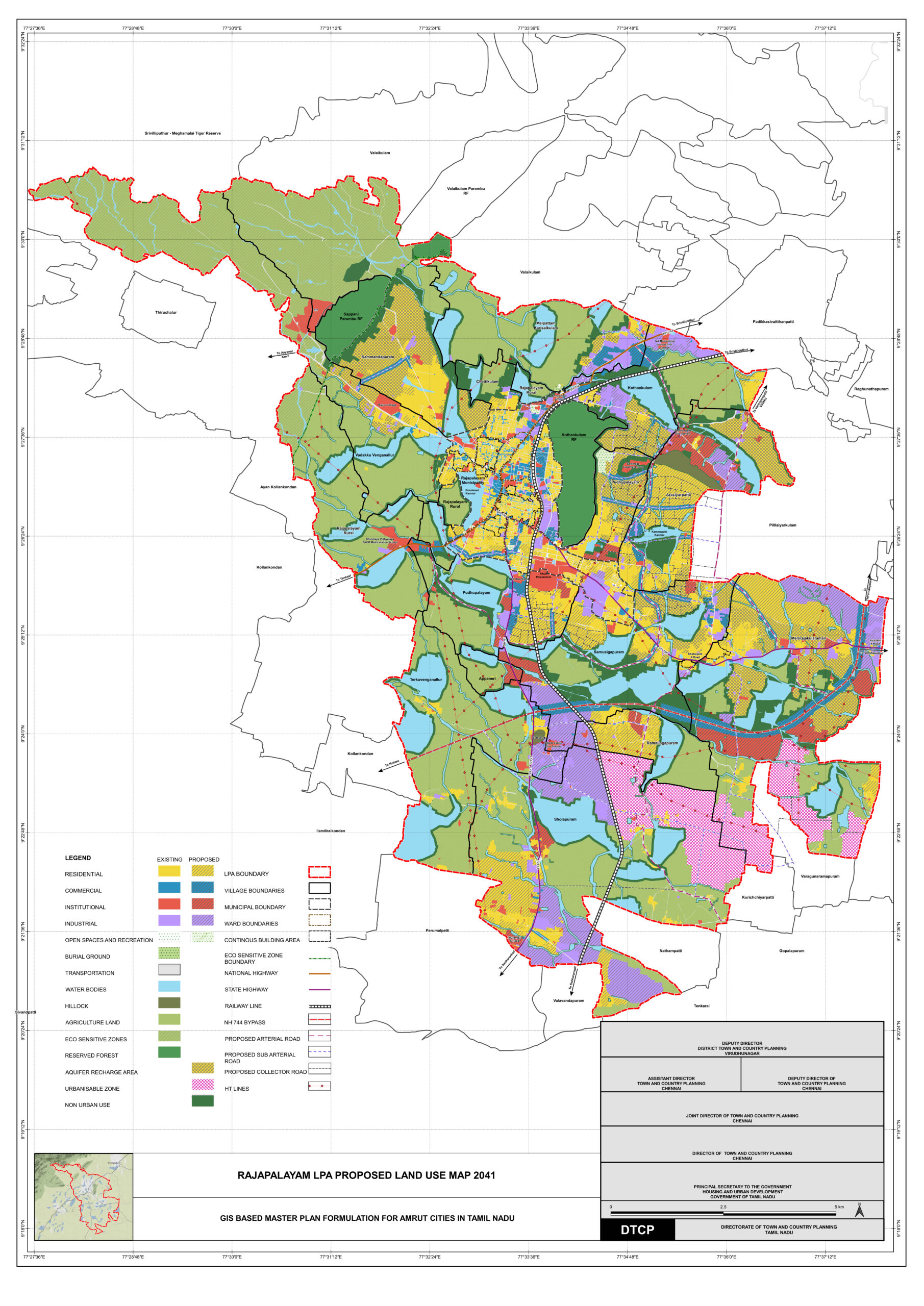 It is important to recall the fact that Rajapalayam has been a major hub for the textile industry and has a history of industrialization spanning from the 1930s. Moreover, the Rajapalayam LPA also has two reserved forests within it, and its western boundary is at the foothills of the eastern slope of Western Ghats, viz, Srivilliputhur Tiger Reserve. This unique mix of a long history of industrialization with a strong presence of eco-sensitive zones, existence of large acreage of water bodies, coupled with the town settlement dating back to more than 300 years makes it important to define how this growing urban settlement can responsibly steward and co-exist with the surrounding eco-sensitive zones.
